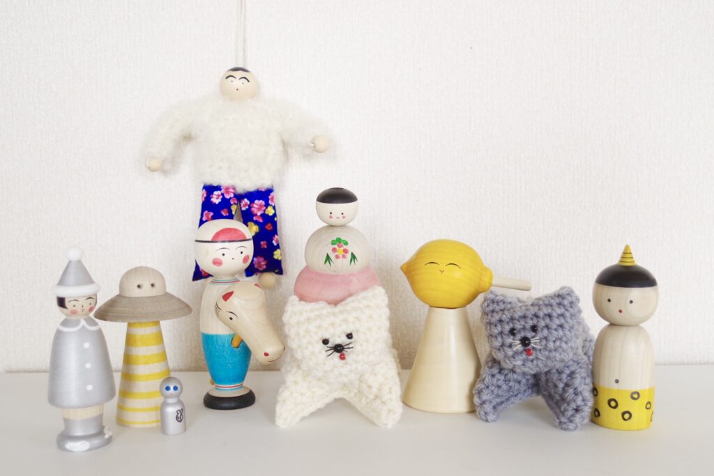 軸原美智子さん主宰の新型こけし、創生玩具、関連グッズなどのデザインプロジェクトブランド「ドンタク玩具社」&手芸ブランド「umaretekitanoyo」とイラストレーター・型染め作家の「山元かえ」さん。