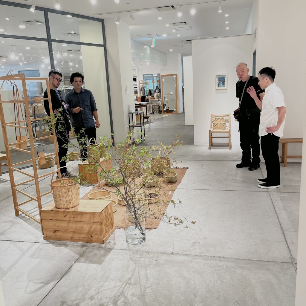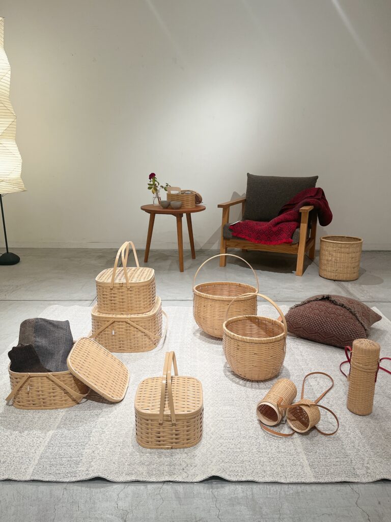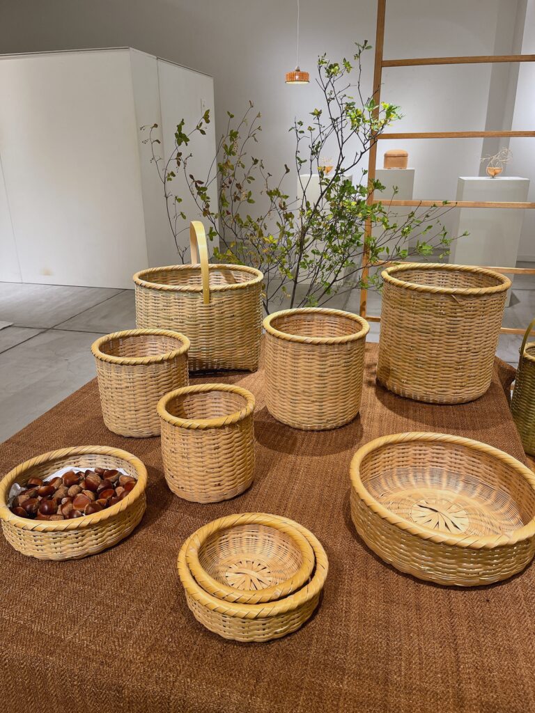 中山秀斗さんと同じ、大分県にある竹工芸の学校を卒業されて、今は青竹や観音笹などを使い日々の生活に寄り添った、確かな道具としての竹かごをつくられています。経年変化を楽しめる竹を使われていて、選ばれるお客様が楽しみにされている様子を会期中に何度も目にしました。