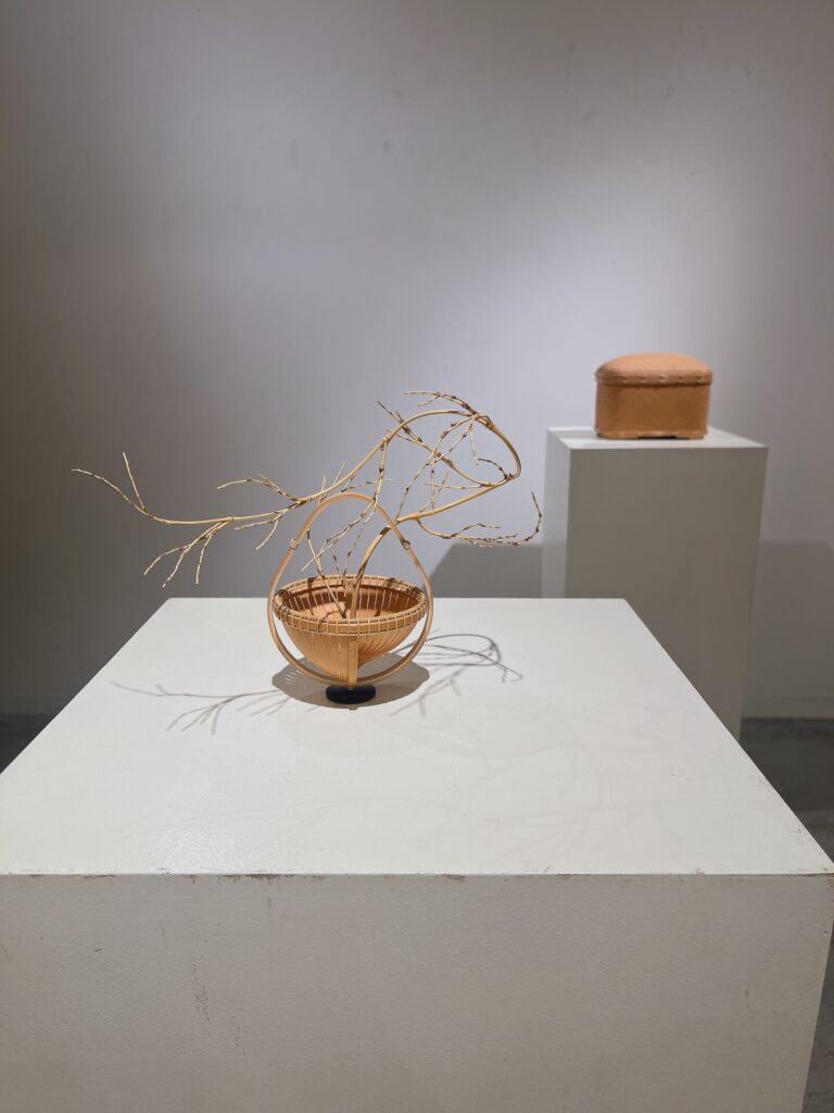 真っ直ぐに生えている竹の枝を油抜きし、熱を加えて意図的に曲げた枝ぶりと、それを受け止める竹籠の凛とした佇まいからは、作家の静かな情熱が伝わってきます。