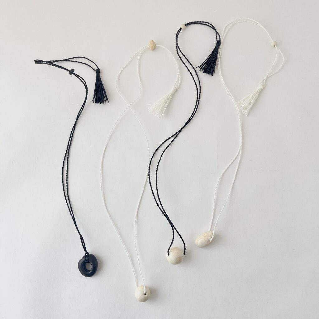 新作の麻ひもネックレスは長さの調整が可能なので、チョーカーのように短くして首の後ろで房を垂らしたり、長めにかけたり。その日の服装や気分に合わせて自由にお使いいただけます。