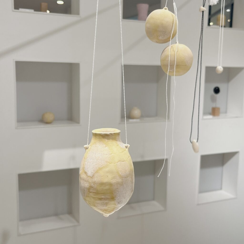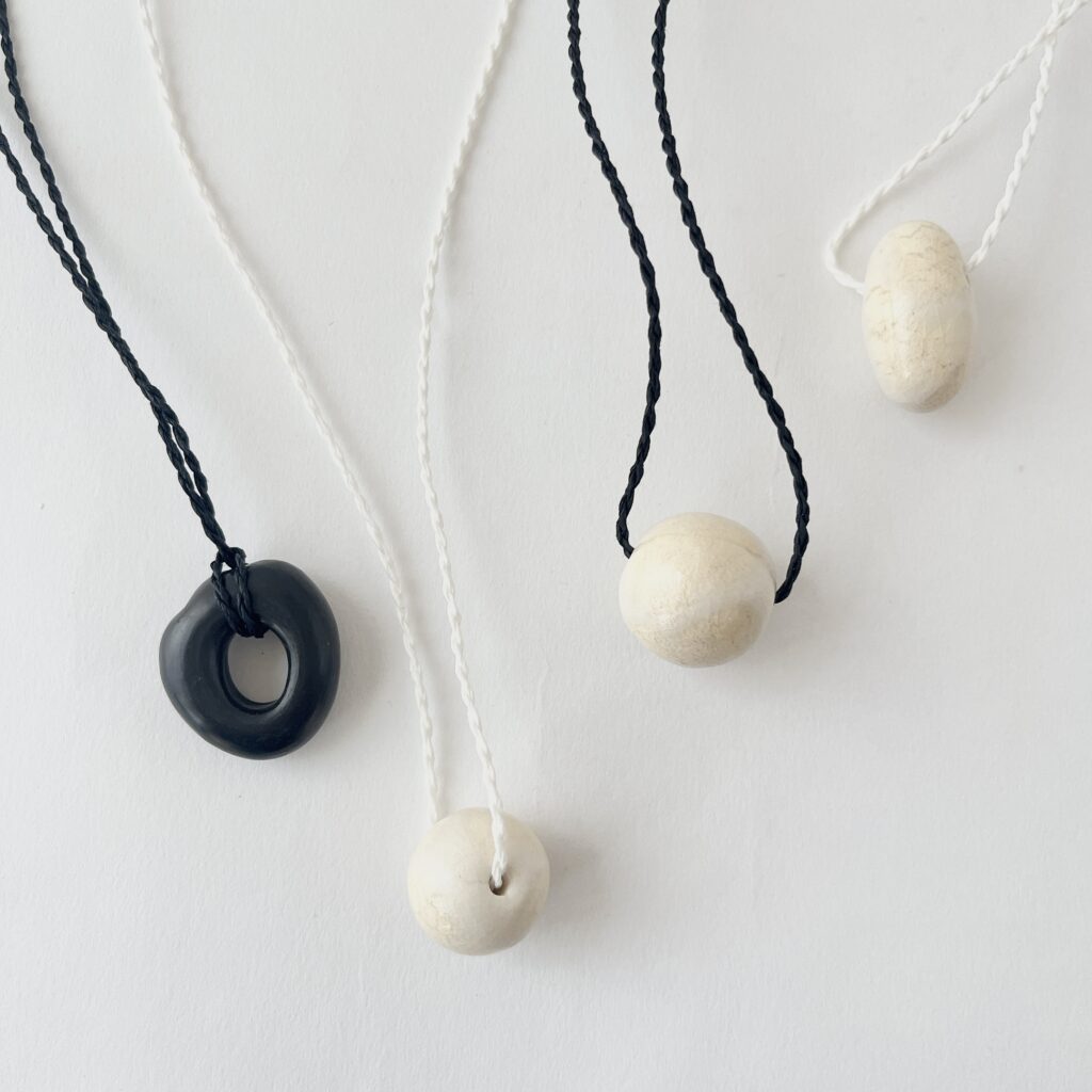 貝や石のような存在感を放つ陶磁の装身具や小作品が並びました。