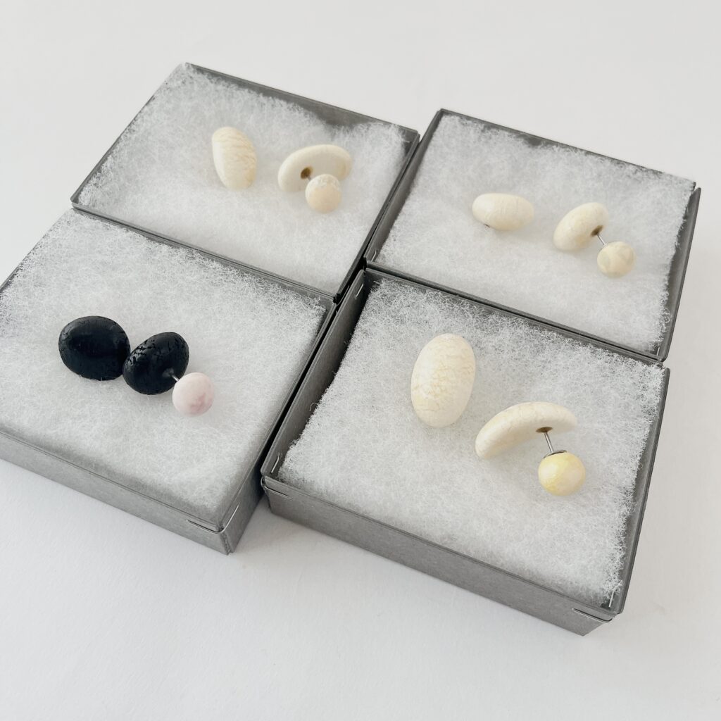 こちらのピアスはカラーキャッチになっており、土と曲線と色のそれぞれの組み合わせを楽しんでいただけます。片耳だけにつけるのもおすすめです。