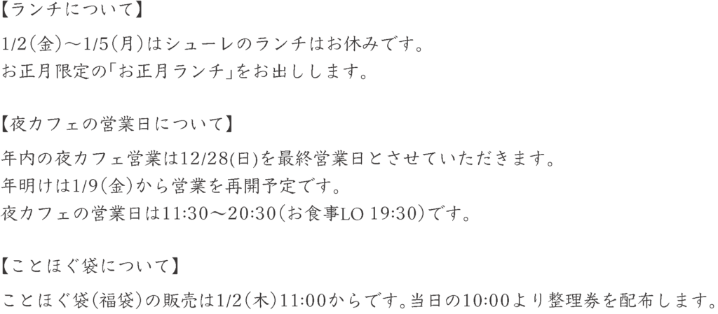 年末年始 営業時間のお知らせ 2025年12月11日 News いつも、まちのシューレ963にご来店いただきまして誠にありがとうございます。年末年始の営業時間についてお知らせいたします。 記載の時間で営業いたします。店内暖かくして、皆様のご来店をお待ちしております。 このページをSNSでシェアする