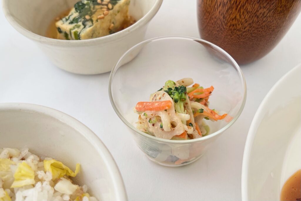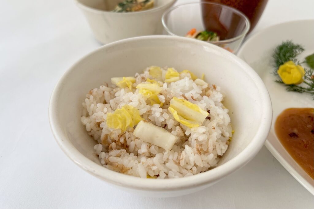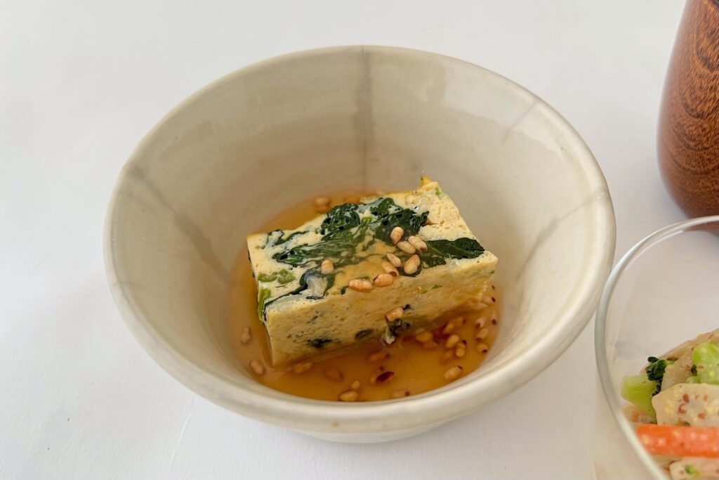 - じゃこと法蓮草の玉子焼き 炒り玄米の餡かけ