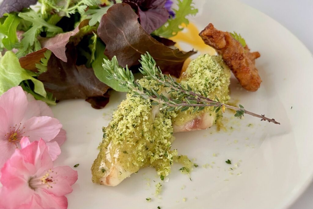 - 鯛の 木の芽香草パン粉焼き 筍の付け合わせ
